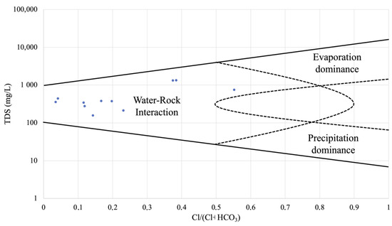 The projection of the results on the Gibbs diagram (Figure 8) shows that all the waters studied are mainly influenced by the phenomenon of water–rock interaction. This implies that the water–rock interaction is the most important natural factor determining the chemistry of all-natural mineral water by recharge from surface water.