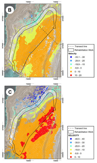 Figure 9C shows the velocity fields computed from Envisat images from 3 to 6 years after the event of 22 March 2000. During that period, the soft clay layer was partially emerged and was creeping at various paces depending on the water content. The destroyed area co-occurred with the zone of maximum subsidence. With respect to the 1990s, the subsidence rates increased. The uplifted zone is also wider, spreading toward the Dead Sea.