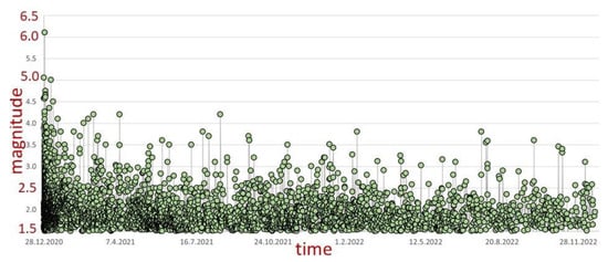 - USGS. Earthquake Catalog: Earthquakes with Magnitudes 3.0 or above from 28 December 2020 to 29 December 2020 in the Chosen Area. 2022. Available online: https://earthquake.usgs.gov/earthquakes/map/?extent=44.44162,14.35913&extent=46.27483,18.99536&range=search&timeZone=utc&search=%7B%22name%22:%22Search%20Results%22,%22params%22:%7B%22starttime%22:%222020-12-28%2000:00:00%22,%22endtime%22:%222023-01-29%2023:59:59%22,%22maxlatitude%22:46,%22minlatitude%22:43,%22maxlongitude%22:18,%22minlongitude%22:13,%22minmagnitude%22:3,%22maxmagnitude%22:7,%22orderby%22:%22time%22%7D%7D (accessed on 28 November 2022).