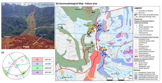 (a) Photo of the Piuro landslide as seen from the opposite slope. Failure, sliding and deposit zones are highlighted; (b) Geomorphological and geological features of the 1618 failure area; (c) Geomechanical features of the study area. Lower hemisphere stereographic projection of the main discontinuity sets. Joint orientation is expressed by dip direction/dip.