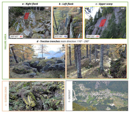 Focusing around the area affected by the detachment, steep scarps are observed in correspondence of the Alpe Prato del Conte locality at an altitude of about 1430 m a.s.l. (Figure 2b and Figure 3a–c). Here, flat morphologies covered by glacial deposits are abruptly interrupted by trenches and steep rock scarps. Trenches have an ESE-WNW orientation and are characterized by a metric opening whose walls consist of strongly disjointed rock masses (Figure 3d).