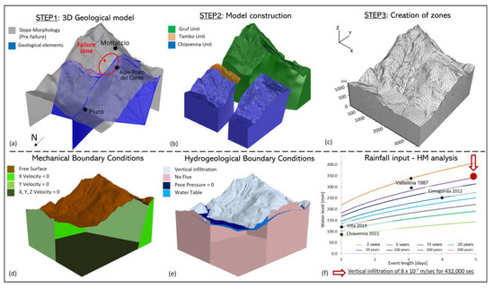 (a) 3D geological model built starting from the geological–structural features of the slope presented in Figure 1d; (b) FLAC3D model building; (c) Discretization into a finite-difference grid by the definition of hexahedral zones; (d) Boundary conditions of the mechanical model; (e) Boundary conditions of the hydrogeological model for the hydro-mechanical analysis; (f) Rainfall input of hydro-mechanical analysis. Identification of input values by evaluating rainfall scenarios in the study area.
