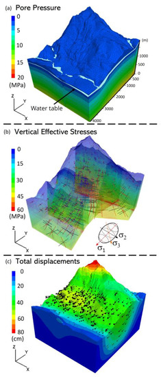 Figure 5b shows the vertical effective stress contours () and the orientation of the stress tensor. It can be observed that the major principal stresses () are directed according to the maximum slope gradient and have an orientation parallel to the slope surface with an inclination angle of about 40 degrees. Their inclination decreases rapidly in the valley floor becoming perpendicular to the valley axis.
