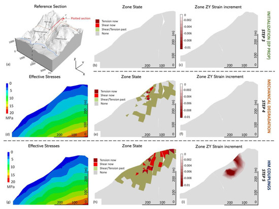 (a) Location of the 2D section showing effective stresses (d,g), zone state (b,e,h), and ZY strain increment (c,f,i) simulated for different steps of the analysis.