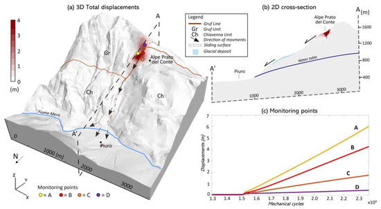 (a) 3D total displacements simulated at the end of the HM coupled analysis. (b) 2D total displacements along a N-S cross-section crossing the failure area. (c) Graph of measured displacements at monitoring points (Figure 6a) with mechanical cycles (defined as the number of timesteps performed).