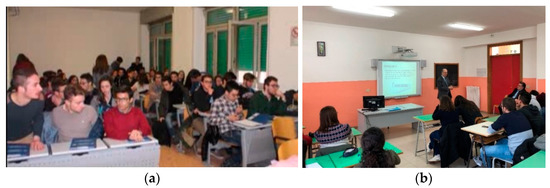 Students and teachers of ISAe in the university classrooms (a) and in those of the school (b) participate, within the framework of the didactic laboratory activities (Action “a” of the PNG), in lessons on the selected geosciences topics and in the exercises of map reading (year 2017).