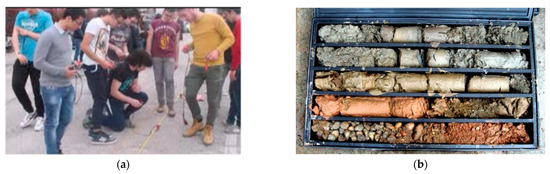 Some examples of outdoor testing: (a) students engaged in laying cables and tools for seismic prospecting (year 2016); (b) pieces of cores in the cataloging boxes from which students derived the stratigraphic and lithologic information from coring subsoil (year 2016).