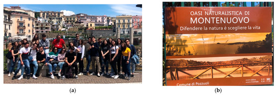 Two moments of the field trip in the Phlegraean Fields (year 2019): (a) visit at the ruins of the Temple of Serapis, in the town of Pozzuoli, Napoli Province; (b) visit at the naturalistic oasis of Monte Nuovo (a tuff cone born from the last Phlegraean eruption in 1538).