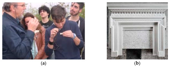 Two moments of the visit to a lapideous valuable georesources (year 2018): (a) palaeontological observations in a ‘Breccia irpina’ quarry in Fontanarosa (Avellino Province); (b) transformation of the quarried stone material into precious artistic artefacts.