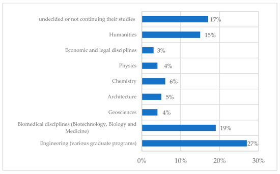 In general, it has been seen that the different ages of students, the longer duration of some degree programs (e.g., medicine and surgery) and the individual histories of each have influenced the choice of university pathways; the majority of students chose the many engineering majors, and many opted for biotechnology, biology and medicine (the latter has particularly selective entrance tests). Smaller numbers concern the choice of courses of study in geosciences, architecture, chemistry, physics and only a few economics and legal disciplines. The remaining students opted for university choices in the psycho-pedagogical, linguistic and humanistic sectors, remained undecided or chose not to continue their studies (Figure 14).