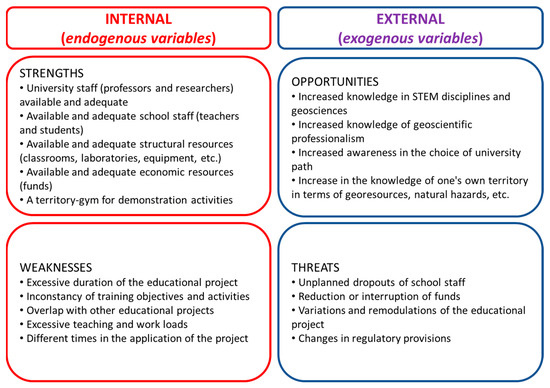 In this context, therefore, geosciences, supported by training projects such as PLS–PNG, can play an important role as an added value as an alternative to other established professions. The experience gained with the PLS–PNG/GEOLAB–UNISANNIO confirms that the students and teachers concerned have improved their knowledge of geosciences and understood their importance in terms of socio-economic and cultural development. In the same years, other similar educational projects with the same aims as PLS–PNG were successfully promoted and implemented at the national level. Among these, we mention the “O3E Project: raising awareness of natural risks at school by observing the environment through seismic, meteorological and hydroelectric measurements”, which took place between 2008 and 2010 (funded by the European Union) and the “International Earth Sciences Olympiad” (IESO), organized annually by the IGEO (International Geoscience Education Organization). At the local level, the propagandistic contribution promoted annually by the regional orders of geologists in concert with the regional school offices of public education is important. In Campania, until 2019, the Order of Geologists promoted information days entitled “The Earth seen by a professional. At school with the geologist”. However, it has been experienced that the application of these projects in educational institutions is not at all simple and immediate as it requires an accurate analysis of the endogenous (internal) and exogenous (external) variables of the system composed of the educational project and the actors who must carry it out. The first concerns the identification of strengths and weaknesses or criticalities of the system. The second concerns the opportunities offered by the system and the threats that loom over it.