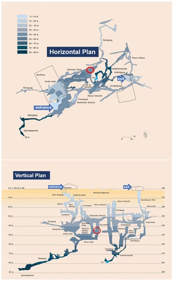 Horizontal (top) and vertical (bottom) plan of the Laichinger Tiefenhöhle cave. Courtesy of Höhlen- und Heimatverein Laichingen. Colour shadings indicate depth below ground surface. Red ellipses mark the location of the experimental setup.
