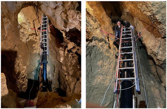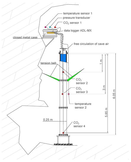 The experimental setup was installed at the bottom of a vertical side shaft in a 90 m deep cave, known as Laichinger Tiefenhöhle (48°28′42.9″ N 9°41′35.9″ E, 780 m a.s.l.), in the Swabian Jura/Southern Germany. The Swabian Jura is known for its multitude of karst caves in carbonate rocks, which are limestone formations. In the case of the Laichinger Tiefenhöhle, the rock also has contributions from dolomite. There are significantly elevated concentrations of CO2 in the cave air, which fluctuate strongly during the year. From our own (unpublished) preliminary sample measurements, it was known that CO2 concentrations in the cave air are in a range between 1% and 2% in the depth of the cave. The Laichinger Tiefenhöhle is a show cave and accessible for visitors. Thus, a connection to a power supply for the measurement equipment is easily possible at this depth. The experiment is located close to the deepest point of the visitor-accessible path at a depth of about 50 m below ground surface; see Figure 1.