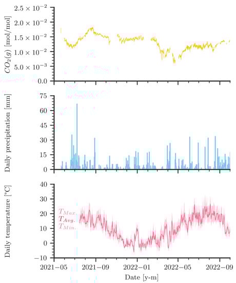 Figure 5 compares daily precipitation and temperature data with the measured curve of the CO2 levels in the cave air. A few distinct features deserve attention. First, let us focus on the precipitation pattern in 2021 and the corresponding strong increase of CO2 in the cave in late summer 2021. The increase of CO2 started with the onset of rain. The following relatively high precipitation paired with summer temperatures likely caused strong microbial activity with potentially high amounts of CO2 in the soil [39,40,41]. It follows a very dry period later towards the fall of 2021. However, the CO2 concentration inside the cave kept rising until the end of August 2021. In 2022, however, there was very little precipitation throughout the summer, unlike the summer of 2021, and microbial activity was likely reduced compared with the year before. The observed peak concentrations in cave air CO2 were smaller in 2022.