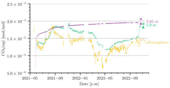 Values of aqueous CO2 concentrations (CO2(aq)) from sensors at various depths are shown by the line plots. The sensor at 5.85 m depth was damaged during sampling in October 2022 and was therefore removed. CO2(aq) concentration calculated from water samples and from the control sensors are indicated with an ‘x’ mark and triangles, respectively.