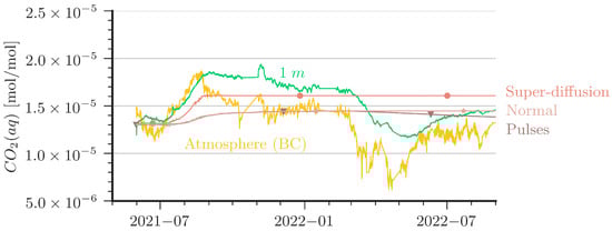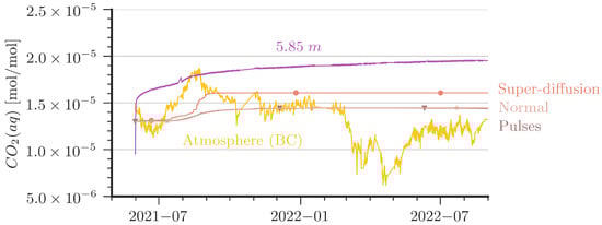 Figure 6 summarizes the data collected from our setup in the cave. The monitoring started in May 2021. Prior to the start of the measurements, the water column was stripped with cave air, which had a CO2 concentration on the order of 15,000 × 10−6 [mol/mol]. In hindsight, this can be classified as an already high initial loading with CO2 in the water. Assuming equilibrium between gaseous and aqueous CO2 to be calculated with Henry’s law, the yellow curve in Figure 6 represents the data of gaseous CO2 concentration in the air above the water table. Note that the values are converted to equivalent aqueous concentrations at the given pressure and temperature conditions. The yellow curve can thus be interpreted as the boundary condition for the CO2 dynamics in the water column. The curves in green and purple show the aqueous CO2 concentrations in 1 m and in 5.85 m water depth, respectively. The data for the control measurements in October/November 2022 are added in the same colours, accordingly. The data logger had a few outages in between. For the numerical simulation, we interpolated linearly where data are missing. Data from water analyses during the control measurement campaign in October/November 2022 are given in Table 1.