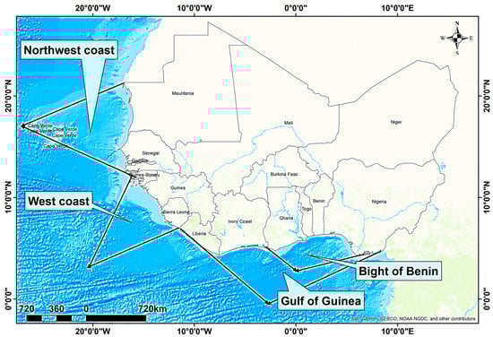 West Africa is one of the regions of Africa and is made up of countries such as Mauritania, Cape Verde, Senegal, Gambia, Guinea-Bissau, Guinea, Sierra Leone, Liberia, Mali, Burkina Faso, Cote d’Ivoire, Ghana, Togo, Benin, Niger, and Nigeria. Apart from Mali, Burkina Faso, and Niger, which are landlocked countries, the remaining countries form the West African coast. Based on geo-environmental characteristics and meteo-oceanographic driving forces, the West African coastline can be grouped into three [64,67]. These include the northwest section from Mauritania to Guinea Bissau, the muddy and sandy west coast from Guinea Bissau to Sierra Leone, and the Gulf of Guinea from Liberia to Nigeria [64,67]. Figure 1 shows the map of West Africa. The West African coastline covers approximately 6000 km [64,67,68]. The coastline is highly dynamic and comprises sandy and rocky beaches, sand spits, estuaries, mud, and mangrove forests [64,67,68,69].