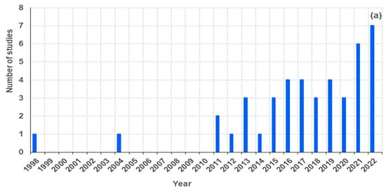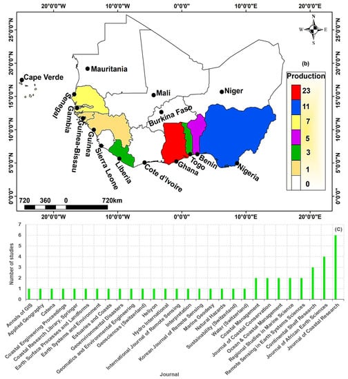 Figure 3a–c show the publication attributes, study locations, and journal sources for the dissemination of research on shoreline change and coastal erosion. From Figure 3a, the most studies (seven) were published in the year 2022, followed by 2021 with six, and the lowest (one) in years such as 1998, 2004, 2012, and 2014. Figure 3a reveals variations in the years of publication. Regarding this review, the first study on the subject occurred in 1998. Following that, interest in the subject declined between 1999 and 2010, with the exception of 2004, when a single study was published. However, interest in the subject has increased since 2011 and particularly since 2021 (Figure 3a). We believe that the decrease in the number of studies between 1998 and 2010 could be due to data challenges, which are a common feature in the region.