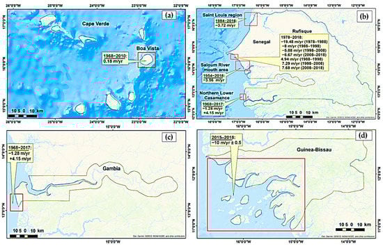 The coastline in the northwest (from Mauritania to Guinea-Bissau) varies from high-energy beaches in Mauritania to mangrove ecosystems along the mouth of the River Senegal [64,68]. Various ecosystem types, such as sandy beaches, estuaries, spits, and barrier beaches, exist in the coastal zones of Senegal and Gambia [64]. Major estuaries in this zone include the Senegal, Gambia, Saloum, and Casamance rivers [64]. Volcanic, rocky beaches can also be found in Cape Verde [64]. Erosion is a common problem in this zone, especially along the low coastlines of Senegal and Gambia. The shoreline in these areas is characterized by accretion, especially between 1968 and 1986 [70]. Notwithstanding, evidence of shoreline recession has been recorded, especially beginning from 1986–2004 and from 2004–2017 [70].