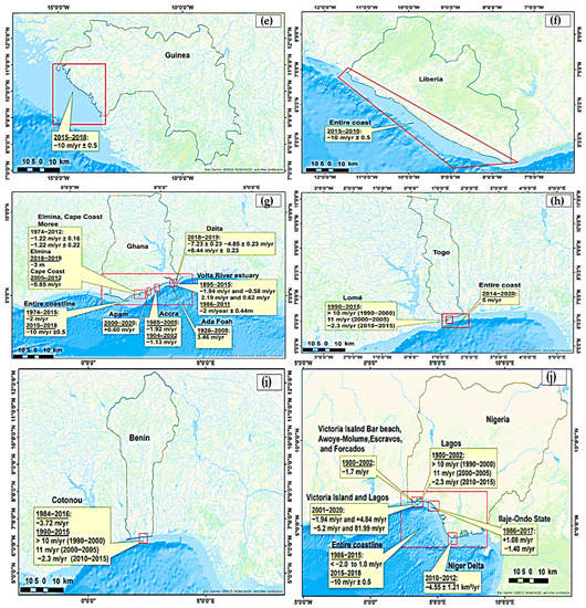 A graphical representation of the shoreline change rates found in the literature for Cape Verde (a), Senegal (b), Gambia (c), Guinea-Bissau (d), Guinea (e), Liberia (f), Ghana (g), Togo (h), Benin (i), and Nigeria (j). Note: Erosion and accretion are represented by the negative and positive values, respectively. The sign (±) indicates the degree of uncertainty. The red, rectangular box denotes the areas of application mentioned in the literature used in this review.