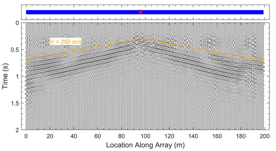 Observed DAS waveforms for Shot 16 at 96 m. The shot location and DAS array are shown above the waveforms as a red star and blue line, respectively. A reference line for a moveout velocity of 250 m/s is also shown.