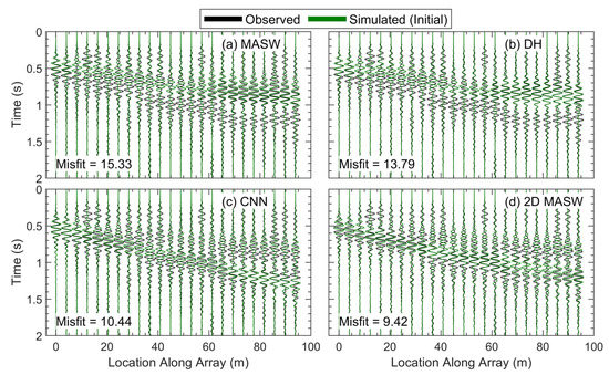 The simulated waveforms for each of the four starting models agree with the observed waveforms to varying degrees, as demonstrated by the GSOTD misfit values displayed in Figure 5. The simulated waveforms for the MASW and DH starting models, shown in Figure 5a,b, respectively, display similar behaviors, with a single high-amplitude wavefront centered a little before 0.5 s at the start of the arrays and expanding in time slightly as the waves travel along the array. The discrepancies between these simulated waveforms and the observed ones (e.g., one wavefront versus two) would likely have caused significant issues if a misfit based on the L2 norm was used in this case. While the MASW and DH waveforms do not agree particularly well with the observed data, their general appearances are quite similar, resulting in similar misfit values of 15.33 and 13.79, respectively. This is not entirely surprising given that the VS profiles used to create the two models are very similar down to a depth of 13.5 m (refer to Figure 3). Below this depth, the profiles still stay within 75 m/s of one another until a depth of 22 m, where the MASW profile indicates a significant impedance contrast.