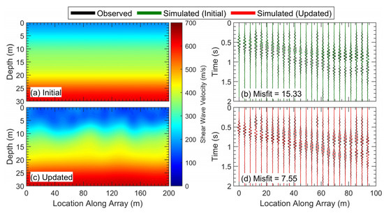 Overall, the goal of these updates was to produce models that better match the true subsurface conditions, which can be evaluated by looking at how the simulated waveforms changed with the updated model and whether they better fit the observed waveforms. To illustrate this, the VS images from the starting and updated MASW models are shown in Figure 7, along with their simulated waveforms for shot 1, compared to the observed waveforms. As discussed above, the VS image from the updated model has a more distinct shallow velocity contrast than in the VS image from the starting model. This change resulted in significant differences in the simulated waveforms between the starting and updated models. While the initial simulated waveforms had only a single high-amplitude wavefront, the simulated waveforms from the updated model exhibit a dual-wavefront behavior that is more consistent with the observed waveforms. This improved agreement is also demonstrated by the lower GSOTD misfit value of the simulated waveforms for the updated MASW model of 7.55, a 51% reduction.