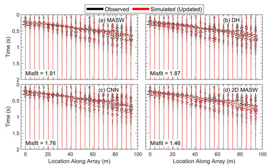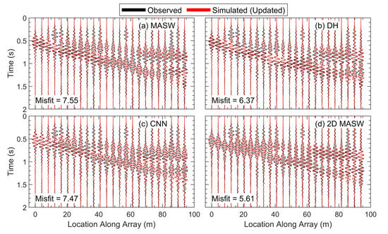 This improved fit to the observed data at the end of Stage 1 is obvious across all four inversions. The observed (black) and simulated (red) waveforms for all the updated models at the end of FWI Stage 1 are shown in Figure 8 using the same waveform pattern used in Figure 5. As discussed above for the MASW model, after the changes made to the models during Stage 1, all four sets of simulated waveforms now have two separate high-amplitude wavefronts that form as the signal travels along the array. While there are some more subtle variations between the sets of simulated waveforms that can also be compared with features of the observed waveforms, the simulated waveforms from all the updated models at the end of FWI Stage 1 better match the overall behavior of the observed waveforms than those from the starting models. Like the MASW model, the GSOTD misfit values for the other three models were also reduced by between 40% and 54%, with values of 6.37, 7.47, and 5.61 for the waveforms from the updated DH, CNN, and 2D MASW models, respectively, which are also shown in Figure 8.