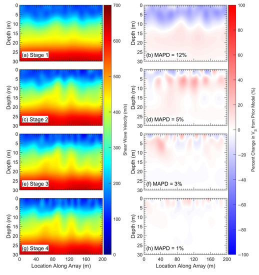 The updated 2D VS images from the MASW starting model at the end of FWI Stages: (a) 1, (c) 2, (e) 3, and (g) 4. The percent deviation of the 2D VS images relative to the 2D VS image from the prior stage are shown for Stages: (b) 1, (d) 2, (f) 3, and (h) 4. The overall mean absolute percent difference (MAPD) values for each updated 2D VS image relative to the initial image at the beginning of each stage are also indicated.