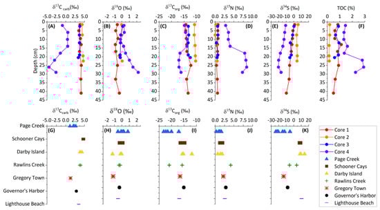 Light stable isotope and TOC core profiles for sediment cores and isotopic data for sediment grab samples. (A–F) are depth profiles of the four different cores and (G–K) are individual grab samples from different locations.