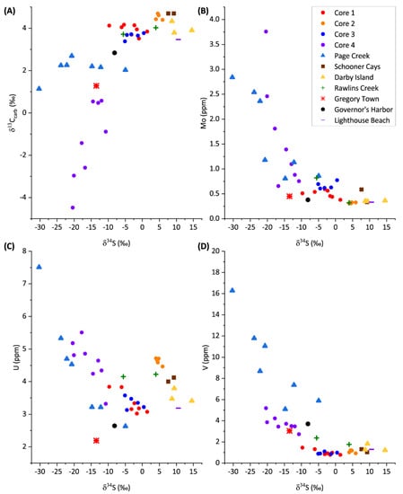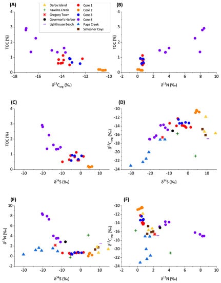 Grab samples from the Schooner Cays, Darby Island, and Lighthouse beach have similar δ34S to core 2 samples (Figure 2 and Figure 3) and, likewise, indicate low levels of BSR. Similar δ34S values to cores 1 and 3 in Rawlins Creek and Governor′s Harbor samples suggests a greater influence of BSR in Rawlins Creek and Governor′s Harbor compared to core 2, Schooner Cays, Darby Island, and Lighthouse beach samples. Core 4, Page Creek, and Gregory Town samples have the most negative δ34S values, suggesting that BSR is an important process in these sediments. In core 4, highly negatively fractionated δ34S may be related to increased TOC which can facilitate a greater prevalence of anaerobic remineralization pathways such as BSR []. While high TOC also likely drives BSR and negative fractionation of δ34S in Page Creek and Gregory Town samples, a lack of grab sample TOC data makes comparison somewhat difficult. However, the strong positive linear correlation between δ34S and δ13Corg in core 4 and Page creek samples (Figure 3) suggests that input of terrestrial organic matter, in addition to marine organic matter, is an important driver of anaerobic processes and early diagenetic intensity in these environments.