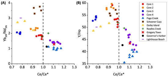 The PAAS-normalized REE’s express slightly negative Ce anomalies in cores 1 through 3 and grab samples (Figure 4) consistent with seawater values [,,,]. Y/Ho ratios are ~50–60 for these samples signifying little to no detrital input, as expected in Bahamian samples [].