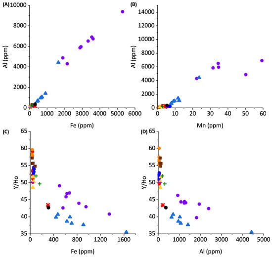 Core 4 and Page Creek have REY distributions unlike those of the remaining samples. Core 4 and Page Creek samples show no Ce anomaly (Figure 4), moderate HREE enrichment, and decreased Y/Ho ratios. The decreased Y/Ho ratios suggest increased terrestrial input which is consistent with stable isotope data, positive correlations between Al, Mn, and Fe, and high Al, Mn, and Fe concentrations (Figure 5). Thus, there is evidence for clay leaching in core 4 and Page creek data which may impart increased ƩREY, lower Y/Ho, and flatter REY profiles in carbonate leaches [].