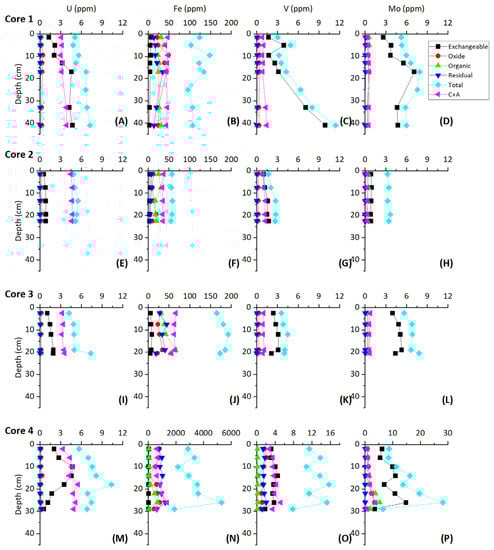 A subset of sediment core samples were sequentially extracted following a modified Tessier extraction [,] method. The extraction method utilizes different reagents to chemically separate sedimentary trace metals into separate partitions: exchangeable, carbonates, oxyhydroxides, organics, and residual (Table 1). Modifications from the Tessier method include modifying the exchangeable reagents to extract non-crystalline uranium []. Bicarbonate effectively leeches U from natural samples and is held in solution as a U(VI)–carbonate complex []. Recent work has shown that sodium bicarbonate extraction is an effective wet chemistry technique to separate non-crystalline U(IV) (reductively precipitated U(IV) from U(VI), termed mononuclear U(IV)) from uraninite []. Other studies have shown the relative importance of non-crystalline U(IV) as a microbial reduction product in a variety of sediments [,,,]. Sodium bicarbonate dissociates in solution, supplying HCO3− and Na+ ions. The use of bicarbonate over other anions, such as CO32−, provides a mild ionic strength and is stable at pH values near neutral and allows for the dissociation of loose ionic bonds while not affecting the pH and associated reactions. HCO3− likely has the greatest leeching effect on positively charged elements, such as U. The difference in ionic character between elements adds complications when directly comparing concentrations of elements in the exchangeable phase.