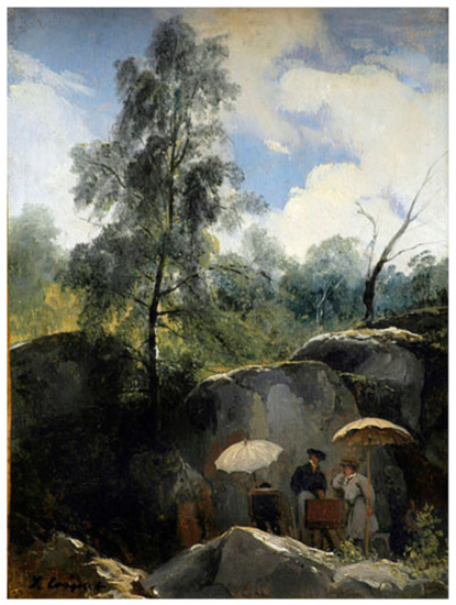 In France, in nature, the first protected area was also protected for artistic reasons [9,10,11]. In fact, in the forest of Fontainebleau, the cutting of old trees and the replacement of oaks by conifers was postponed as early as 1836 under the influence of painters and naturalists. During the Second Empire, the empress was sensitive to the paintings of those who would come to be known as the Barbizon School (Jean-Baptiste Corot, 1796–1875, Jean-François Millet, 1814–1875, Jules Coignet, 1798–1860, etc.) (Figure 1), and the artists asked for her intercession. The first reserve was created by decree of Napoleon III in 1861 [12]. For the first time, the concern of “nature protection” under the aesthetic and landscape angle was associated with the forest management. This area of the Fontainebleau forest was classified as a biological reserve in 1953.