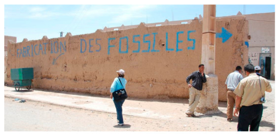 In Morocco, the preparation of fossils and their trade is very developed in some regions, and many are acquired for scientific research and are found in Moroccan museums or around the world. Some geological objects are also sold in local stores as handicrafts or decorative items displaying beautiful fossils (e.g., in Erfoud town, as well as in other towns). Many geologists recognise some pieces as artefacts (made of several pieces of different organisms), and artisans produce beautiful, but artificial, objects. These pieces can be sold, and they help the local economy and are not a danger to the geological heritage of the area. It is only necessary to ensure that these pieces are not sold as objects of authentic nature. The buyer should also be careful, even if sometimes artisans announce the colour on their points of sale by frankly displaying “fossil manufacture” (Figure 5).