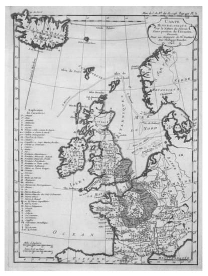 The first geological maps showing a global vision of geology were the result of an inventory of the mineral resources of France. The result was first a geographical map with symbols. This map, signed by Jean-Étienne Guettard, Antoine-Laurent Lavoisier, and Antoine-Grimald Monnet, was completed in 1767 and published in 1780. It was preceded by a real geological map with contours, drawn by Jean-Étienne Guettard, a naturalist supported by the Duke of Orléans. Guettard [31] presented his synthesis under the name of “Carte minéralogique sur la nature du terrein d’une portion de l’Europe” in 1746 (Figure 7). This map was not very precise in its geological contours, but it clearly showed the continuity of the contours of the different units on both sides of the English Channel. The geology of the English Channel was not known at that time. There was, thus, an abstraction, an intellectual construction, a model, which are the characteristics of a scientific novelty. A geological map is a model. In this document, the author “proposed to show by this map that there is a certain regularity in the distribution that has been made of stones, metals & most other fossils”. He recognises three concentric bands: the “sandy” band in the centre, which corresponds roughly to the Cenozoic, the “marly” band, shaded on the map, which corresponds to the Mesozoic, and the “shaly” band for the older terrains, most of which are Palaeozoic.