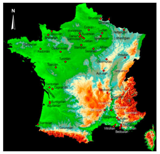 - Jonin, M. Mémoire de la Terre. In Patrimoine Géologique Français; Delachaux et Niestlé, EDF Fondation et Réserves naturelles de France: Paris, France, 2006; p. 192. [Google Scholar]