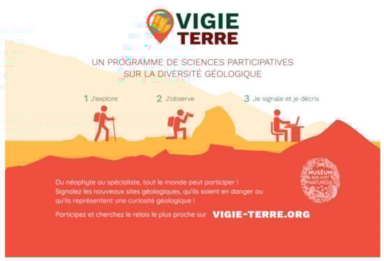- Steinhausser, A.; Egoroff, G.; Mansilla-Sanchez, A.; Detienne, L.; Rouget, I. A Citizen Science Program to Report Fresh Outcrops: A New Tool to Appropriate Geological Heritage in France. 10th International ProGEO online Symposium, Abstract Book. 2021, pp. 117–118. Available online: https://hal.science/hal-03288545 (accessed on 6 March 2021).