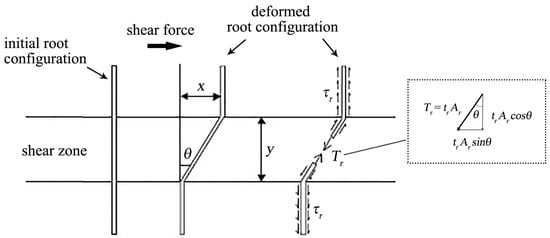 Among the root “breakage” models that allow quantifying this apparent root cohesion , the pioneering and so-called Wu and Waldron’s model was proposed by the two Authors Wu [56] and Waldron [55] independently of each other. At the foundation of Wu and Waldron’s model is the assumption that when a shear force is applied to the soil, the roots—assumed as rigid bars positioned orthogonally to the shear plane—deform in the shear zone (y) rotating rigidly with respect to the initial vertical configuration (θ) due to frictional forces developing at the root–soil interface (Figure 1). Root rotation mobilises the root tensile force, , entirely. By considering θ, two components of the root tensile force can be obtained: