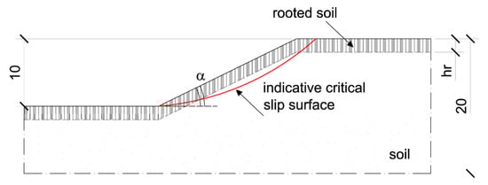 The investigated slopes were chosen so that the initial stability condition (represented by the stability index with design value of the effective soil shear strength angle) is equal and corresponds to slopes without vegetation that are in limit equilibrium conditions (). Once additional loads (i.e., in this case, statically applied inertial forces modelling seismic loadings) act on the slope, collapse occurs: the addition of vegetation should help in reaching a new safety condition. The first step was defining the design values for actions and resistances so that these quantities were equal. Afterwards, the characteristic values were back-calculated from them by using partial factors of the Eurocode 7 (specifically, those from the combination 2 of the design approach 1—ref. [48]). Table 3 lists the values used in the parametric analyses.