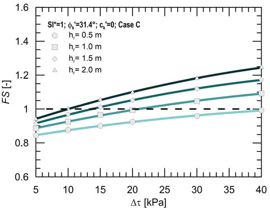 Figure 3 shows the factor of safety trend on varying root contribution to the shear strength Δτ, obtained for a slope configuration with α = 26° and ϕk′ = 31.4°, and the seismic case C. Results for different root depths hr are illustrated. The dashed line in the graph represents the limit equilibrium condition (FS = 1).