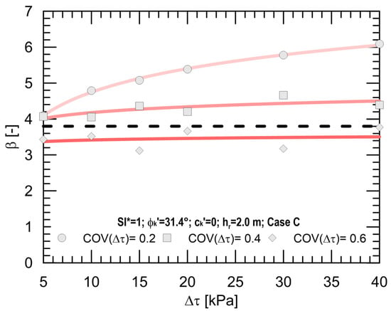 Reliability trend for varying Δτ and COV(Δτ), for ϕk′ = 31.4° and seismic case C.