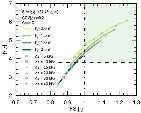 The three different curves refer to all the seismic case scenarios investigated and to the best condition in terms of data uncertainty (COV(Δτ) = 20%). The trend in curves highlights that the lower the seismic input, the better the slope stability (considering both the deterministic and the probabilistic aspect), as expected. To be more specific, β-FS combinations that do not satisfy the safety and reliability criteria simultaneously were obtained only for Case C and for the lower root contributions to the shear strength investigated. By analysing the graphs more in-depth it is possible to observe that, ranging from the seismic scenario A to C, in the case of hr = 2 m and with equal Δτ, the reliability index decreases from 19% when Δτ = 40 kPa to 33% when Δτ = 5 kPa. Similarly, for roots with hr = 1 m, the reliability index decreases from 24% when Δτ = 40 kPa to 37% when Δτ = 5 kPa.