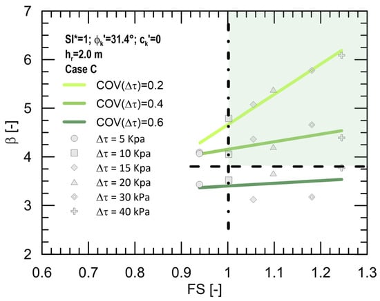 By investigating the other coefficients of variation, a change in performance occurs. For instance, for the same slope configuration and seismic input (α = 26° and ϕk′ = 31.4°, case C) and the best condition in terms of slope thickness reinforced with root (hr = 2 m), the reliability index on varying the corresponding FS is illustrated in Figure 6 for all the root coefficients of variation investigated. In this case, outcomes point out that both the safety and reliability criteria are satisfied only when COV(Δτ) are equal to 20% and 40%. This means that the ultimate limit state partial factors applied to actions and geotechnical parameters in the deterministic analyses cannot guarantee the reliability level required since they were not calibrated to take into account such a large dispersion of data coming from the root contribution; in fact, high COV percentages lead to the achievement of reliability values that are far from the target reliability index.