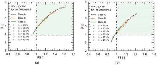 Subsequently, the influence of the seismic input in terms of safety and reliability was investigated on the same slope configuration (α = 26° and ϕk′ = 31.4°) as well. Figure 7 shows the comparison between β-FS curves for varying root contributions to the shear strength, obtained in the case of roots 2 m long (Figure 7a) and 1 m long (Figure 7b), respectively.