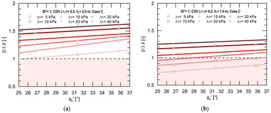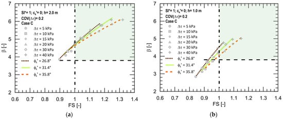 To study how different combinations of slope angle of inclination and soil shear strength angle influence the slope response, Figure 8 shows the comparison between β-FS curves for varying root contribution to the shear strength, obtained for all the α-ϕk′ combinations investigated. The analyses refer to roots 2 m long (Figure 8a) and 1 m long (Figure 8b), COV(Δτ) = 20% and seismic case C. It can be noted that β highly increases with increasing root contribution to the shear strength for the other investigated slope configurations as well, congruently with the results obtained for slope with α = 26°, ϕk′ = 31.4°, confirming the good response of this bio-engineering sustainable measure when the best condition both in terms of reinforced slope thickness and data uncertainty is considered. Specifically, when hr = 2 m and the root contribution to the shear strength ranges from Δτ = 5 kPa to Δτ = 40 kPa, β increments are equal to 50% and 41% for the slope combinations α = 22° − ϕk′ = 26.8° and α = 30° − ϕk′ = 35.8°, respectively; when hr = 1 m, β increments are equal to 68% and 53%. Given that all the investigated slopes were chosen with the same initial stability index SI*, this result means that the gradient of the β-FS curves decreases with increasing soil shear strength angle. It can also be noted that, with equal Δτ, the greater the shear strength angle, the greater the combination of reliability index and factor of safety obtained. Moreover, the complete correspondence between both the safety and reliability criteria is achieved for values of Δτ gradually increasing with decreasing soil shear strength angle.