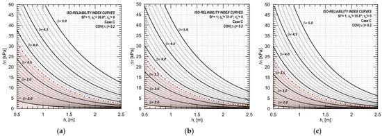 β-FS curves for varying Δτ and hr, for ϕk′ = 31.4°, COV(Δτ) = 20% and seismic case C.