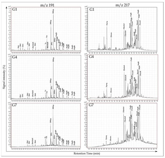 GC-MS chromatograms of the ions m/z 217 and m/z 191 for the samples G1, G4 and G7. For the m/z 217, the biomarkers are as follows: 21Preg, C21-5α(H) sterane; 22homo, C22 sterane; 27βαdiaS & R, C27βα20(S) & (R) diasterane; 27αααS, C27ααα20S sterane; 27αβR, C27αββ20R; 27αβS, C27αββ20S sterane; 27αααR, C27ααα20R sterane. The same pattern also holds for the C28 and C29 steranes. For the m/z 191: 23–24tri, C23-C24-Tricyclic terpane; 25triS & R, C25-Tricyclic terpane (S) & (R); 24tet, C24 17,21-Secohopane (C24); Ts, 18α(H)-22,29,30 Trisnorhopane; Tm, 17α(H)-22,29,30 Trisnorhopane; 29Hop, 17α(H),21β(H)-30-Norhopane; 29Ts,18α(H)-30-Norneohopane; 30Hop, 17α(H),21β(H)-Hopane; 30Mor, 17β(H),21α(H)-Moretane; 31–35αβS and 31–35αβR, 22S-17α(H),21β(H)-Bishomohopane-22S-17α(H),21β(H)-Pentakishomohopane and 22R-17α(H),21β(H)-Bishomohopane-22R-17α(H), 21β(H)-Pentakishomohopane.