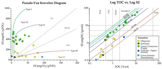 (Left): Pseudo van Krevelen diagram showing hydrogen (HI; 100xS2/TOC in mgHC/gTOC) and oxygen indices (OI; 100xS3/TOC in mgCO2/gTOC). Kerogen type lines represent typical kerogen maturity paths based on [73]. (Right): Plot of the TOC (%wt) versus S2 (mgHC/grock). HI annotated in lines is measured in mgHC/gTOC [72,74]. Legend applies for both plots.